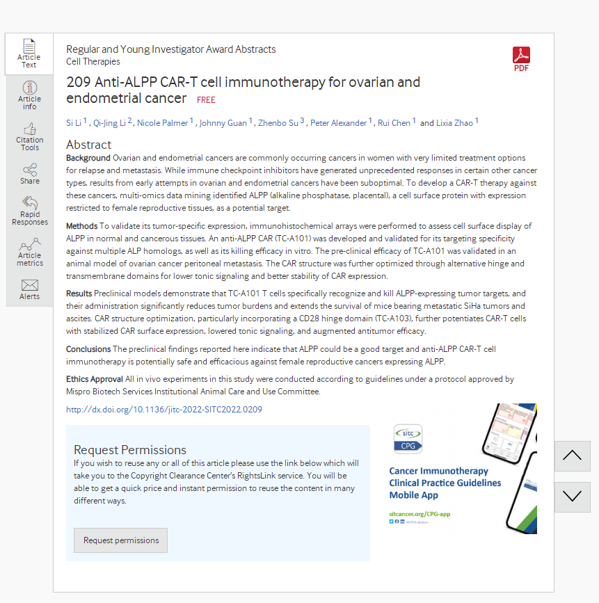 摘要標題Anti-ALPP CAR-T cell immunotherapy for ovarian and endometrial cancer 用于人體內(nèi)卵巢癌和子宮內(nèi)膜癌的抗 ALPP CAR-T 細胞免疫療法